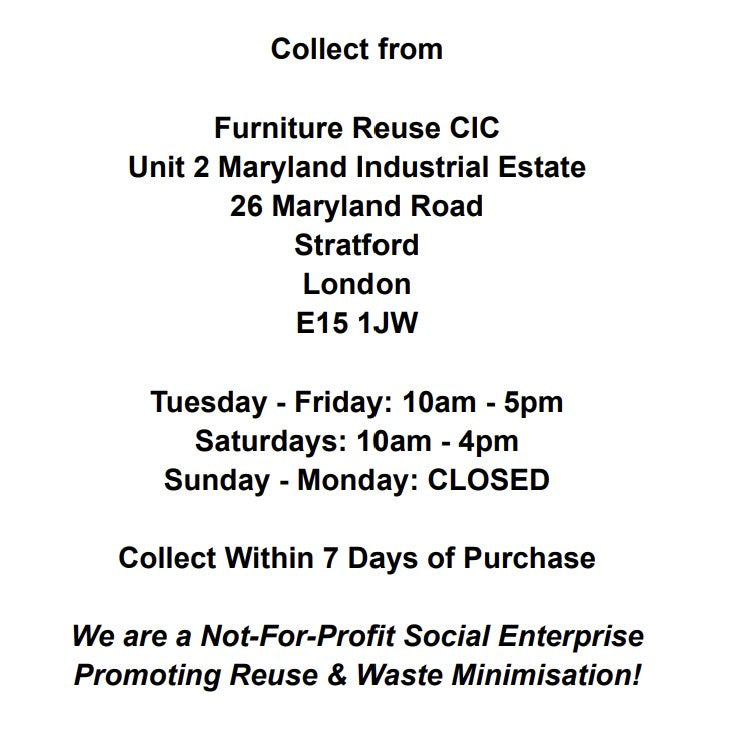 If you are collecting your second hand furniture item please allow us at least 1 working day to get your item ready for collection.